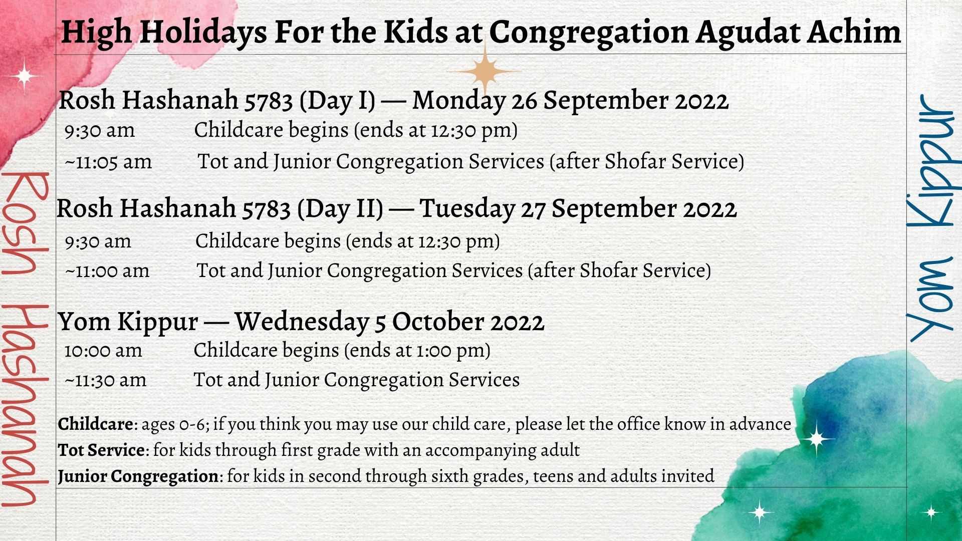 - Babysitting: Rosh Hashanah Mornings, Mon and Tues 26-27 Sep from 9:30 AM – 12:30 PM; Yom Kippur Morning Wed 5 Oct from 10:00 AM – 1:00 PM